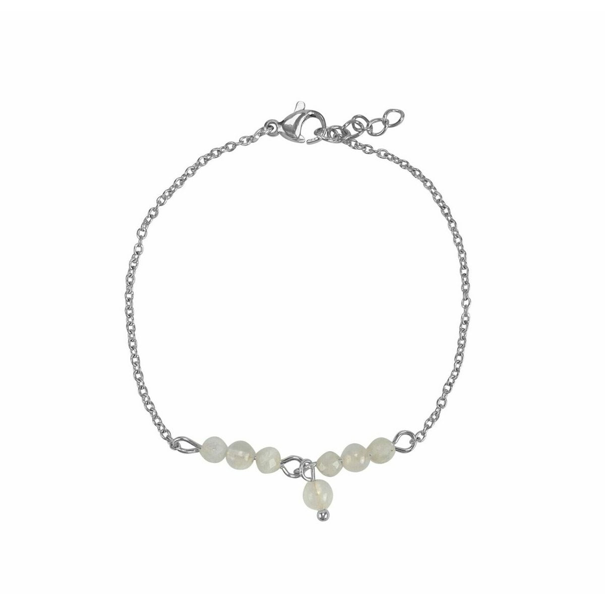 Stainless steel armbandje met Maansteen en Jade. De Maansteentjes zijn facet geslepen en de Jade steentjes rond. Het hangertje aan het armbandje is ook een wit Jade steentje.
