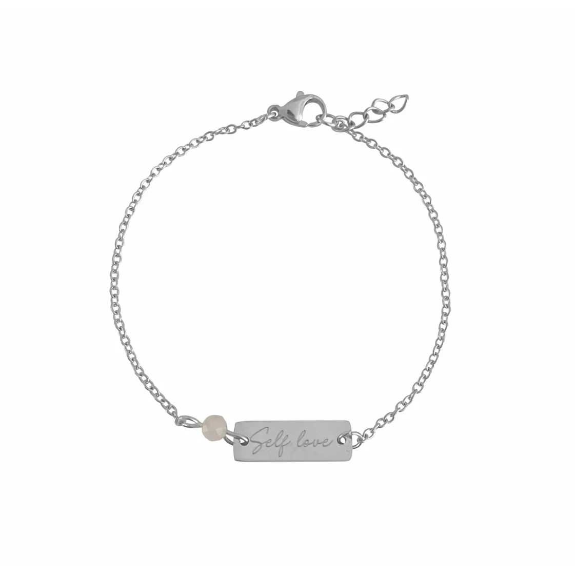 Stainless steel armbandje met een Rozenkwarts steentje en een plaatje met daar op "Self Love" gegraveerd. Het plaatje is ontworpen en gegraveerd in ons eigen atelier.