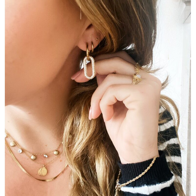 De oorbel heeft een diameter van 16 mm en de ovale kristallen hanger heeft een afmeting van 22 mm.