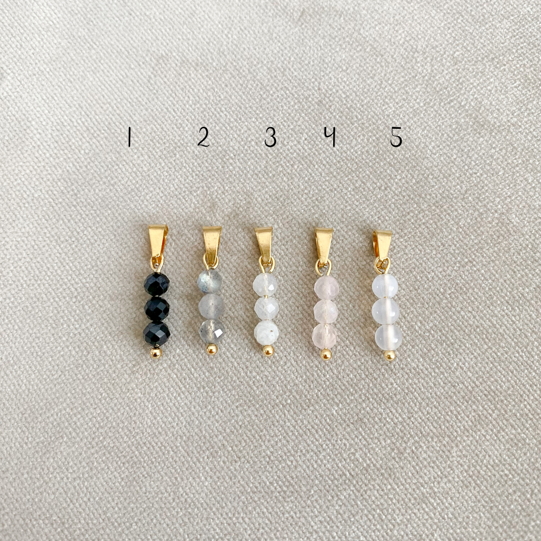 Add-on power edelsteen hangers. Elke edelsteen heeft zijn eigen kracht. Aan deze hangers hebben we drie edelsteentjes gemaakt, met elke hanger zijn eigen kracht. Het schuifje kun je over een slotje van een ketting schuiven, zo kun je elke dag de hanger dragen die op die dag resoneert. De Melk Agaat is rond geslepen, de rest van de edelsteentjes is facet geslepen en hebben een mooie glinstering.