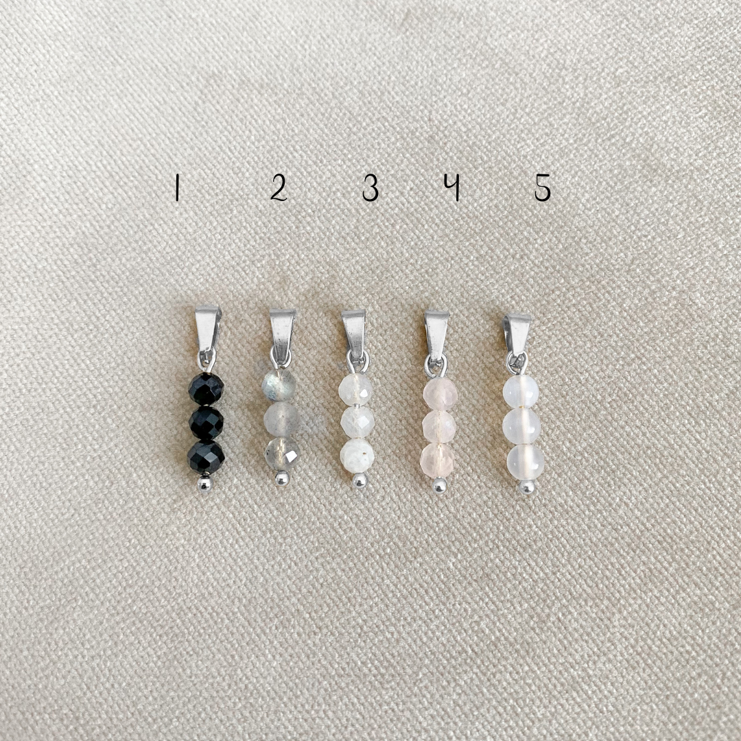 Add-on power edelsteen hangers. Elke edelsteen heeft zijn eigen kracht. Aan deze hangers hebben we drie edelsteentjes gemaakt, met elke hanger zijn eigen kracht. Het schuifje kun je over een slotje van een ketting schuiven, zo kun je elke dag de hanger dragen die op die dag resoneert. De Melk Agaat is rond geslepen, de rest van de edelsteentjes is facet geslepen en hebben een mooie glinstering.