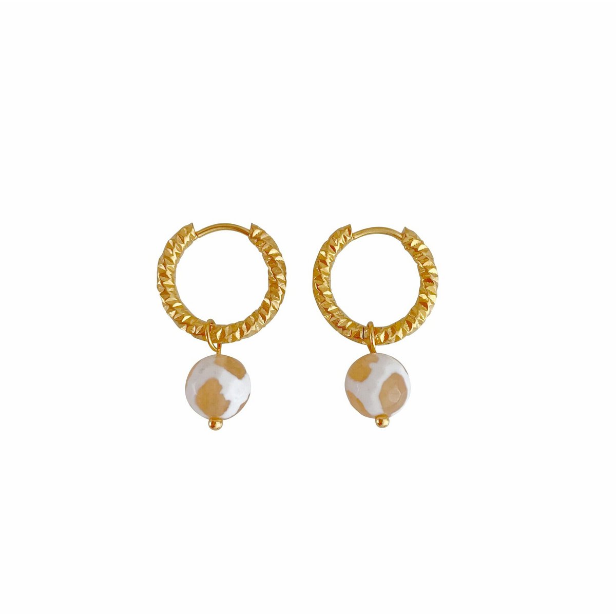 Gouden Dzi Agaat oorringen, gemaakt van stainless steel. De oorringen zijn bewerkt en hebben een mooie glans. Je vindt het Dzi Agaat steentje in meerdere sieraden in onze collectie terug, zo kun je een leuke sieraden set samen stellen. Ga hier bijvoorbeeld naar het Dzi Agaat & Maansteen armbandje of de Dzi Agaat Ketting.