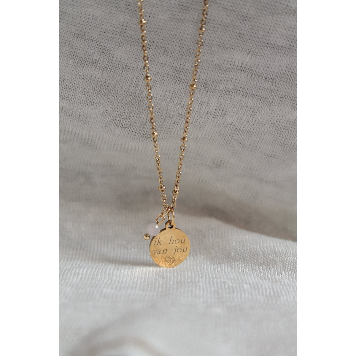Stainless steel ketting met een stainless steel hanger. In de hanger is “Ik hou van jou” gegraveerd met daaronder een hartje. Aan de ketting hangt een Rozenkwarts steentje. Een super mooi cadeau met veel betekenis. Het Rozenkwarts steentje staat voor liefde. Niet alleen voor een geliefde, maar ook voor familie en vrienden, spirituele liefde en liefde voor jezelf. Het Rozenkwarts steentje maakt de ketting extra speciaal.