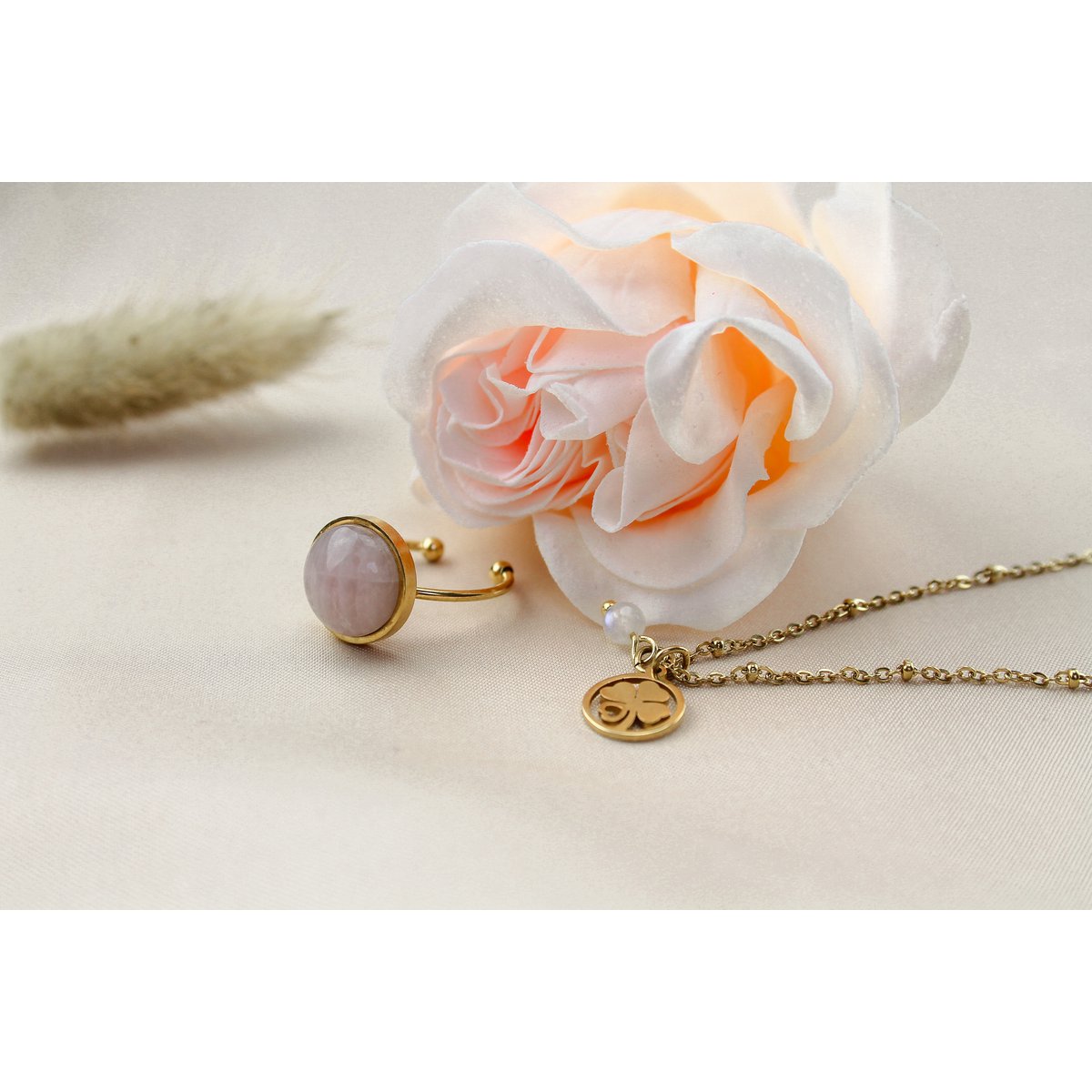 Stainless steel ketting met een klavertje vier bedeltje en een Maansteentje. Als je goed kijkt zie je dat het klavertje vier een klein hartje in het blaadje heeft. Een extra mooi detail!