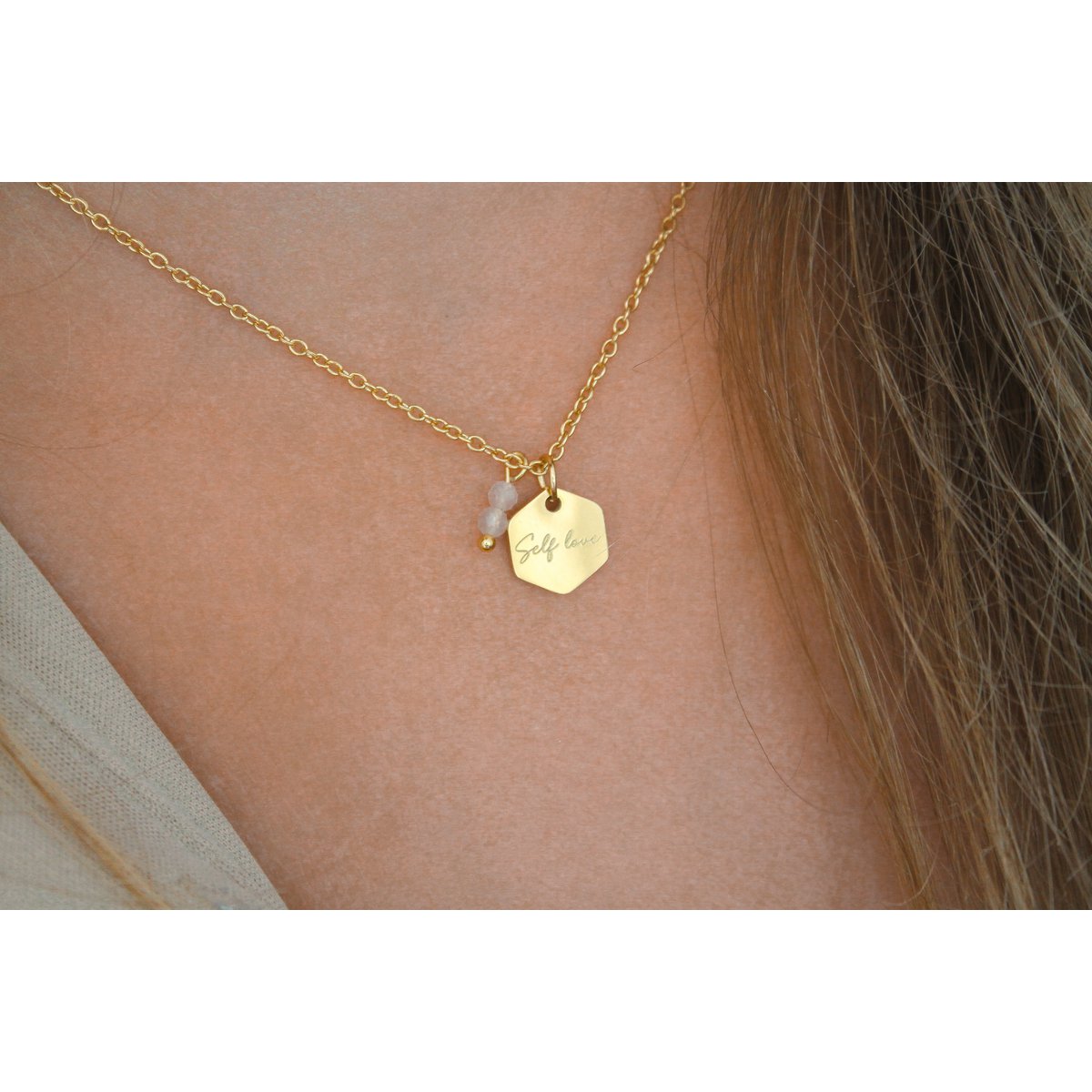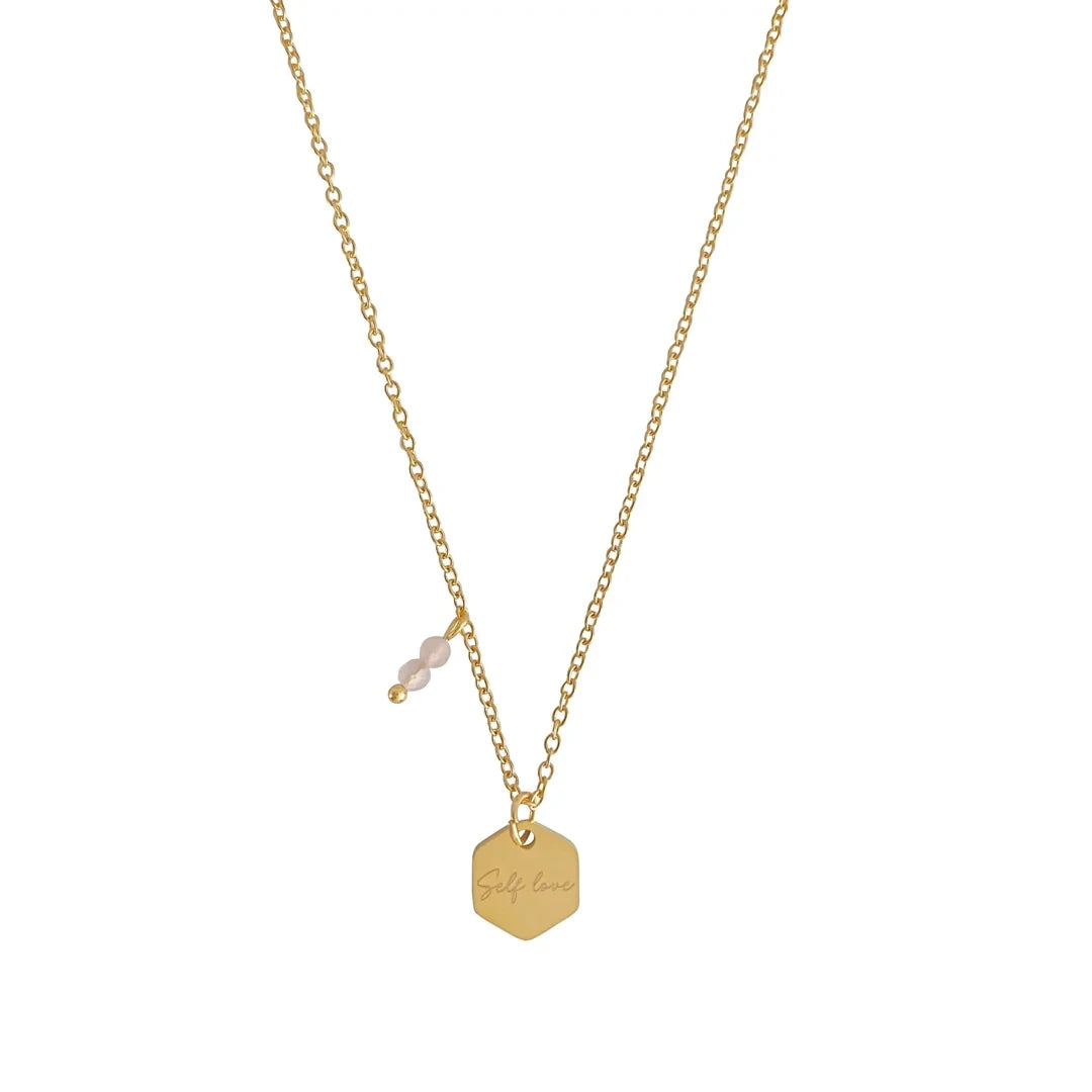 Stainless steel ketting met een zeshoek plaatje waarop Self Love gegraveerd is. Het plaatje is ontworpen en gegraveerd in ons eigen atelier. Aan het kettinkje hangt een hangertje met twee Rozenkwarts steentjes.
