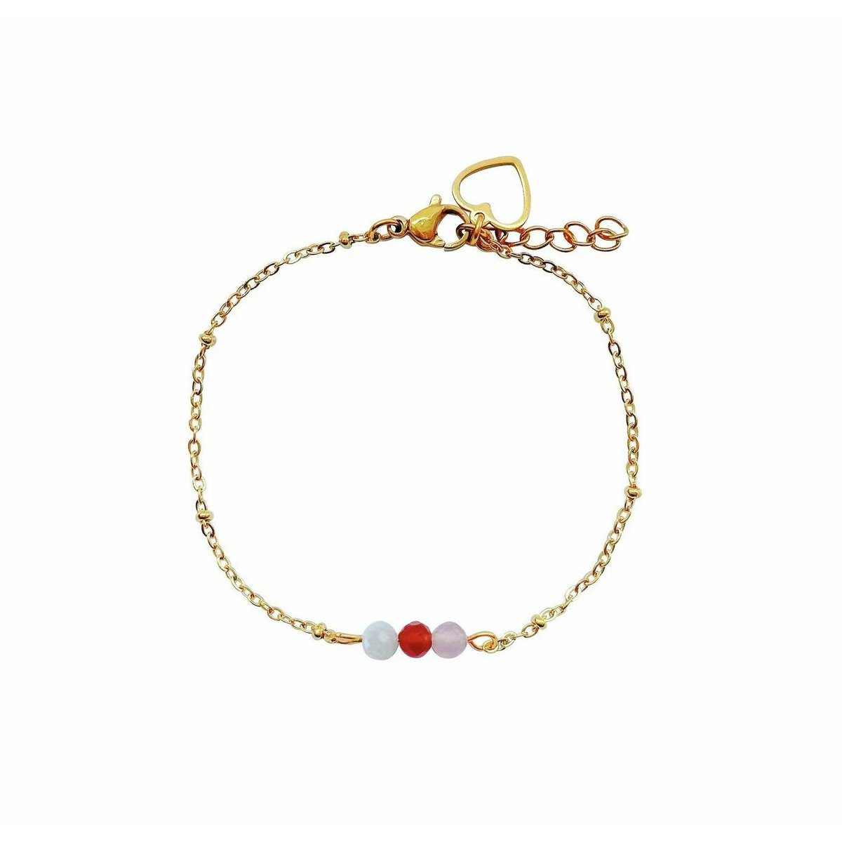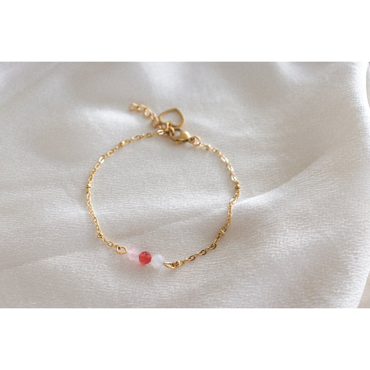 We hebben de drie edelstenen gekozen die samen krachtig zijn en alledrie een eigen mooie werking hebben. Aan het armbandje vind je Rozenkwarts, Carneool en Maansteen. Elk van deze edelstenen heeft unieke eigenschappen. Zij dragen bij aan emotionele balans, fysieke energie en spirituele harmonie.