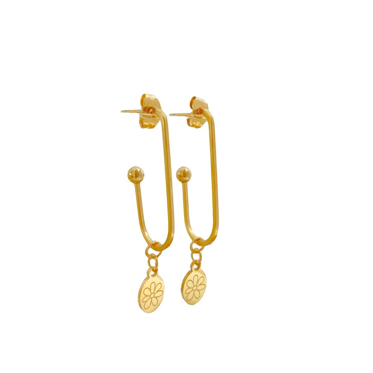 Lange oorringen bloemetje, gemaakt van stainless steel. Het bedeltje met het bloemetje is in ons atelier gegraveerd. Dit bloem bedeltje vind je in meerdere sieraden terug in onze nieuwe collectie.