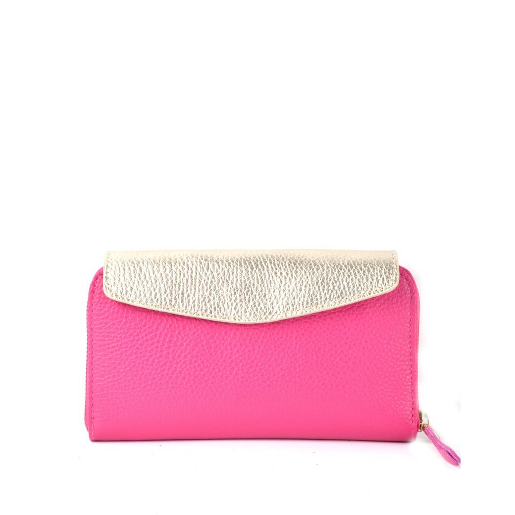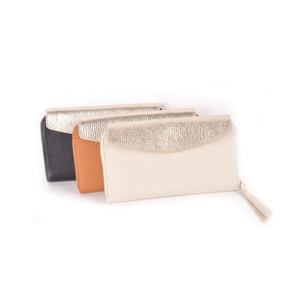 Materiaal : Leer Sluiting : Ritssluiting Afmeting : 19,5 cm x 10 cm x 2,5 cm Voering : Nee Afwerking :Goudkleurig metaal Polsbandje : Nee