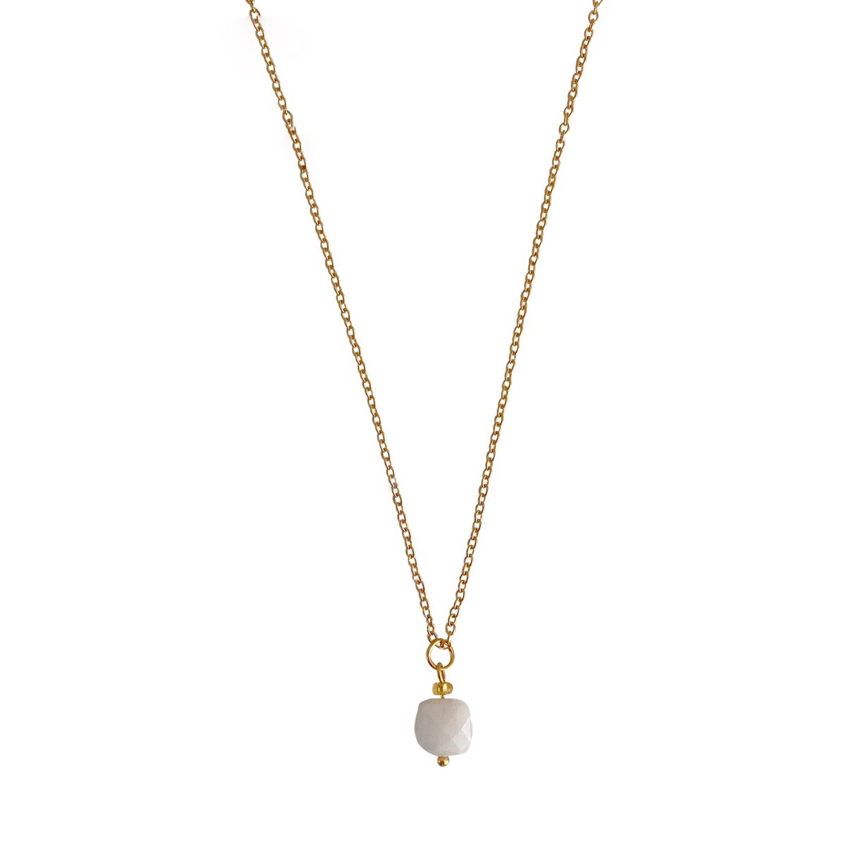 Maansteen facet ketting, gemaakt van stainless steel. De Maansteen is werkelijk prachtig! De kubus is facet geslepen en glinstert vanuit elke hoek. Boven de kubus zit een klein gouden kraaltje. Elke steen is uniek dus elke Maansteen facet ketting is uniek!