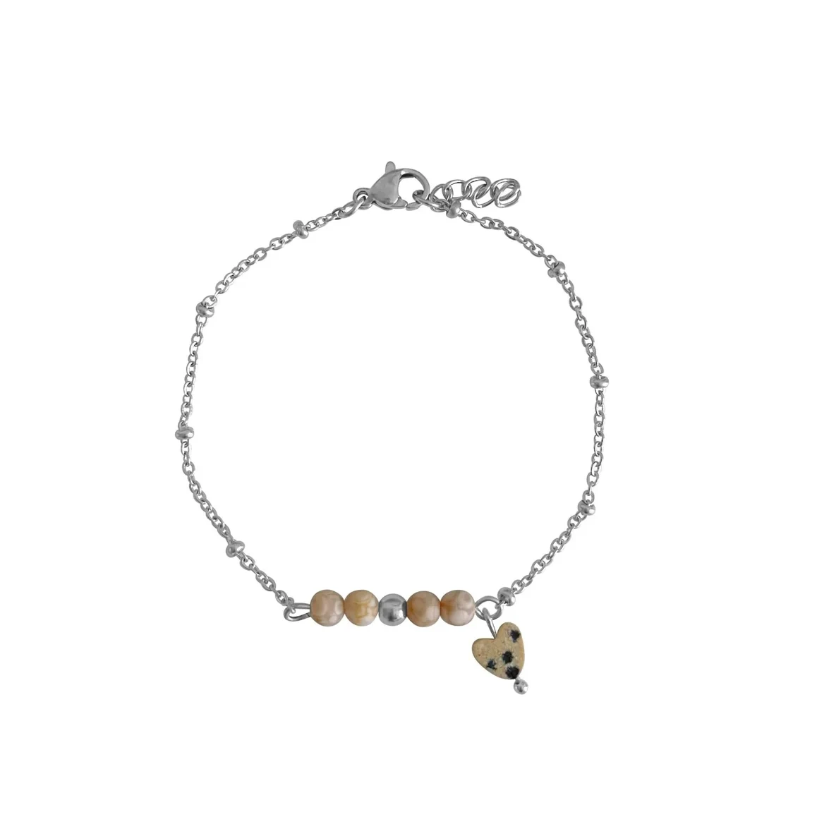 Armbandje met drie Maifan steentjes en een Dalmatier Jaspis hartje. Het armbandje is gemaakt van stainless steel en is hypoallergeen, kleurvast, sterk en duurzaam. Elk armbandje wordt met liefde handgemaakt in ons atelier.