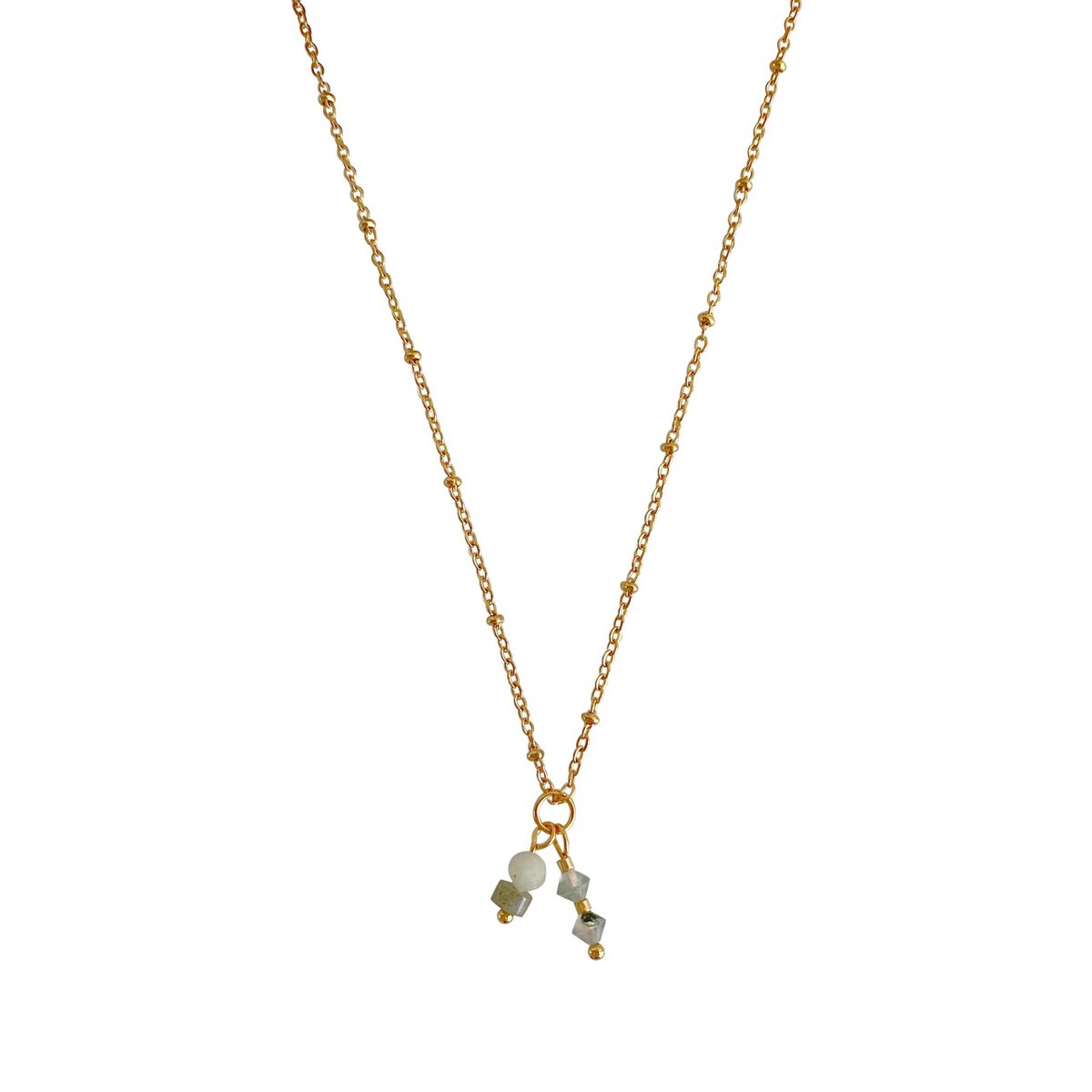Mos Agaat, Jade & Labradoriet ketting. De Mos Agaat steentjes hebben een bijzondere vorm en zijn facet geslepen. Het Jade steentje heeft een limoen groene kleur en is ook facet geslepen. De Mos Agaat, Jade & Labradoriet ketting is gemaakt van stainless steel. De ketting is hypoallergeen, duurzaam, sterk en kleurvast.