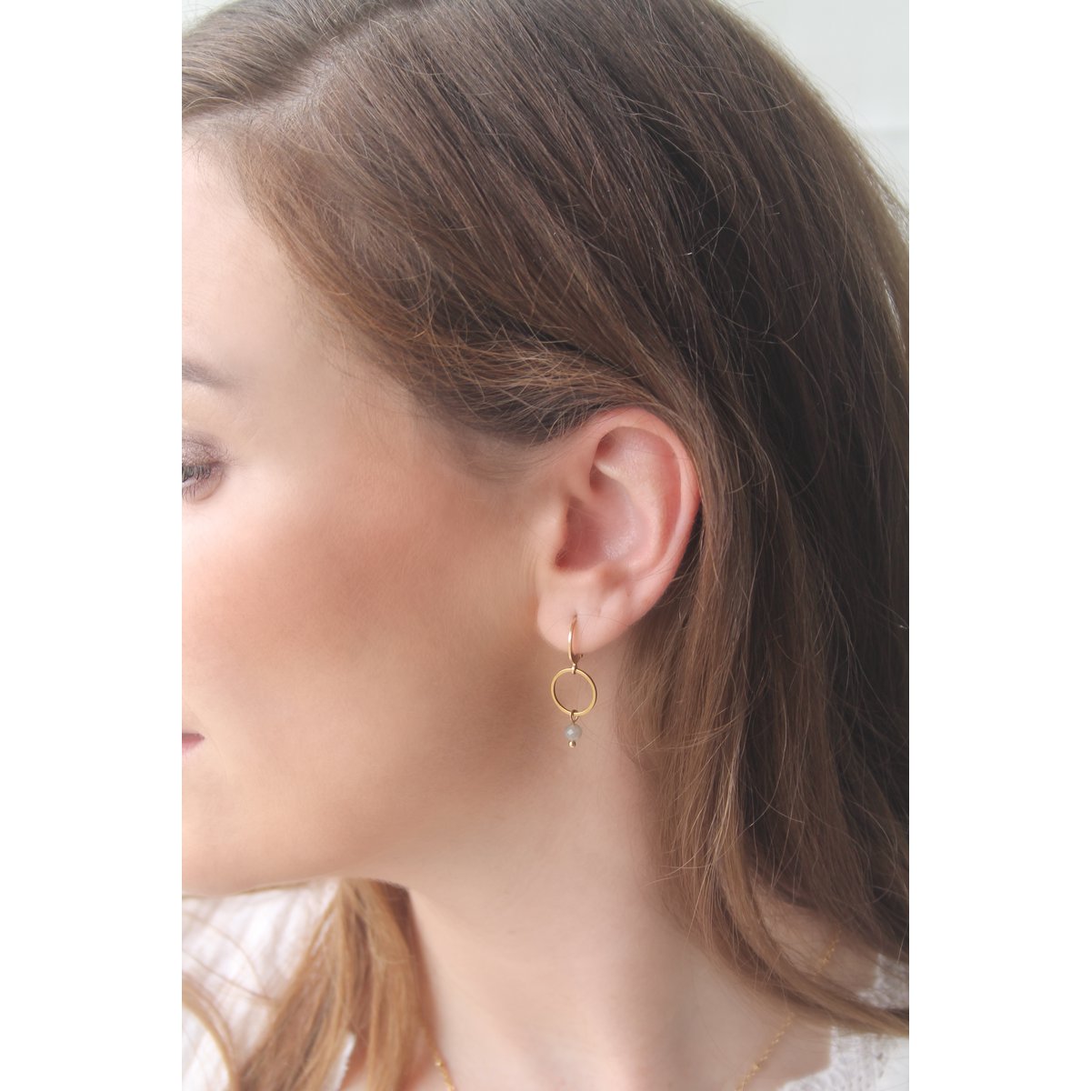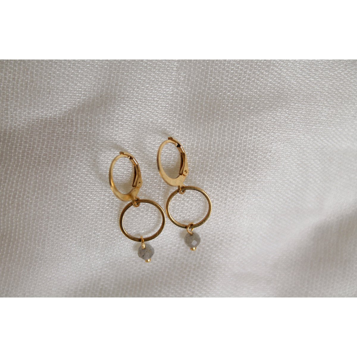 Stainless steel oorringen met een Labradoriet steentje. De oorring heeft een hefboompje, waardoor je de oorring gemakkelijk open en dicht kunt doen.