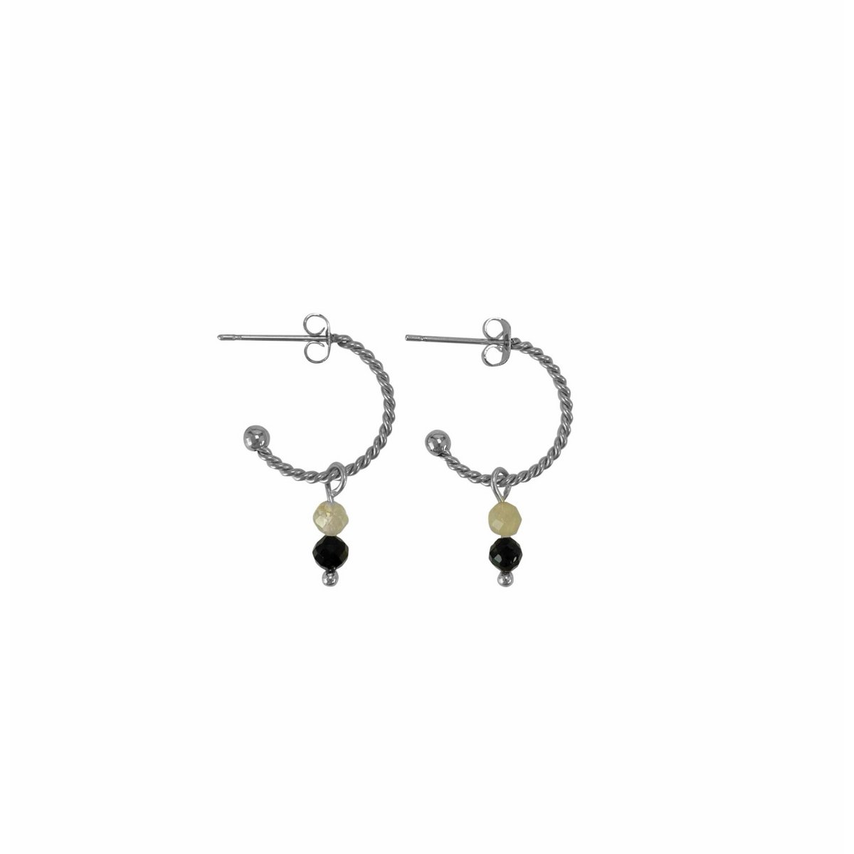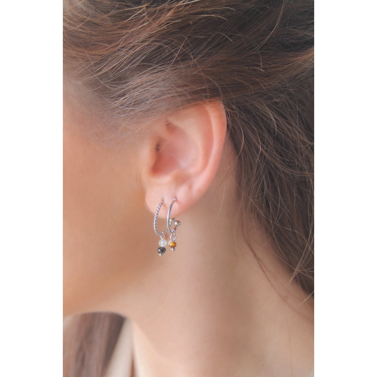 Stainless steel oorringen met Zwarte Toermalijn & Rutielkwarts steentjes. Elk steentje is uniek, dus elke oorring is uniek. Combineer het met het bijpassende armbandje.