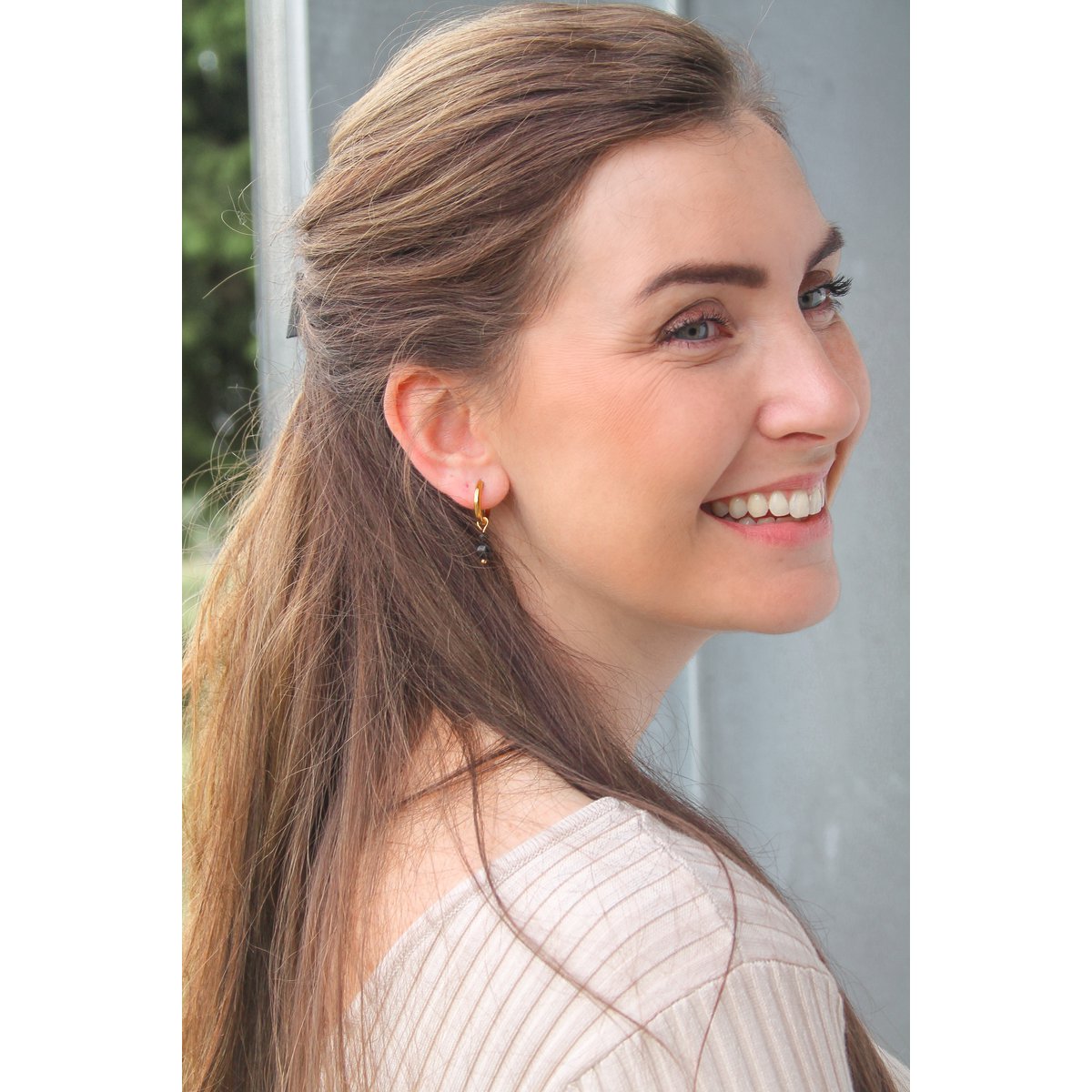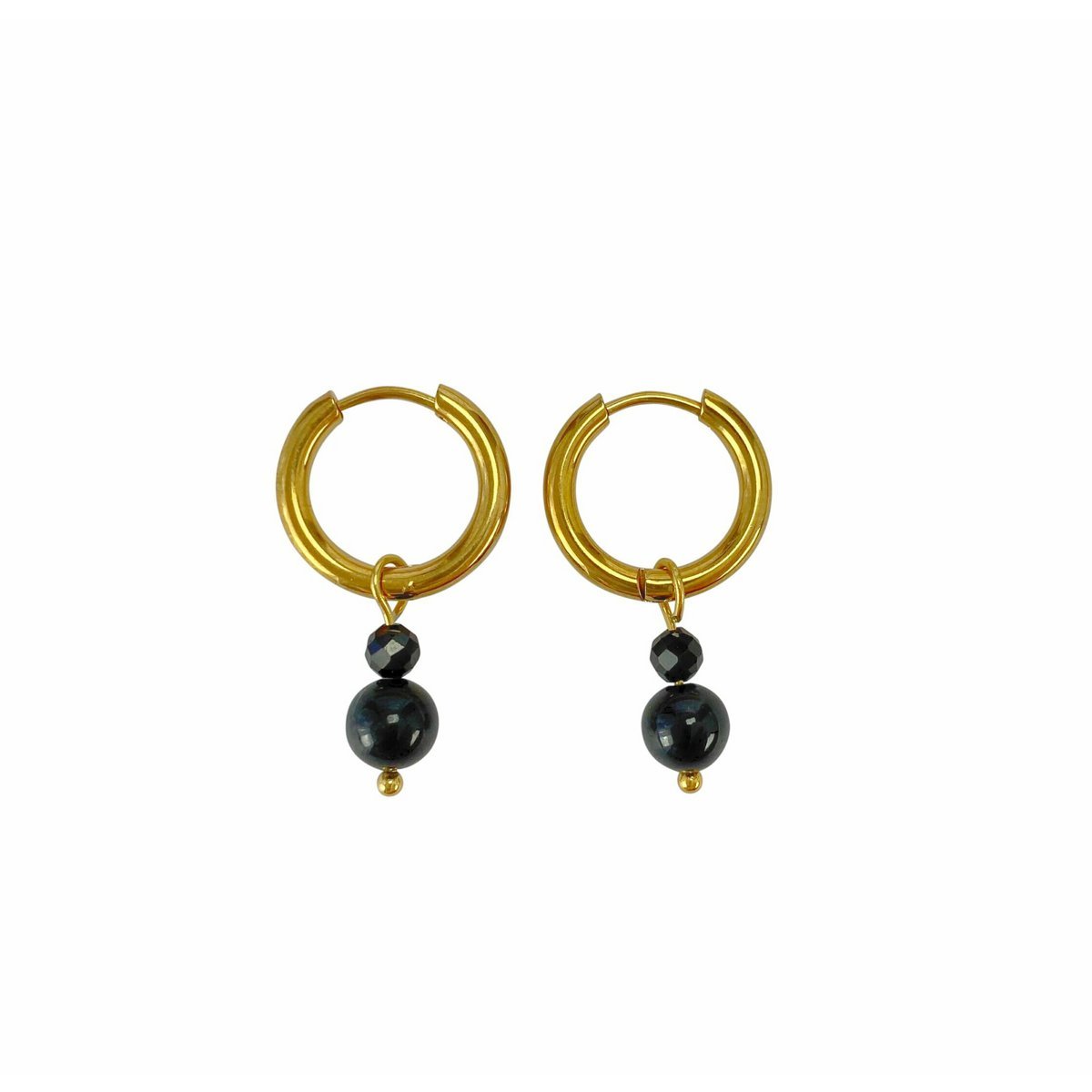 Stainless steel oorringen met twee Zwarte Toermalijn steentjes. Het onderste steentje is rond en het steentje erbovenop is facet geslepen.
