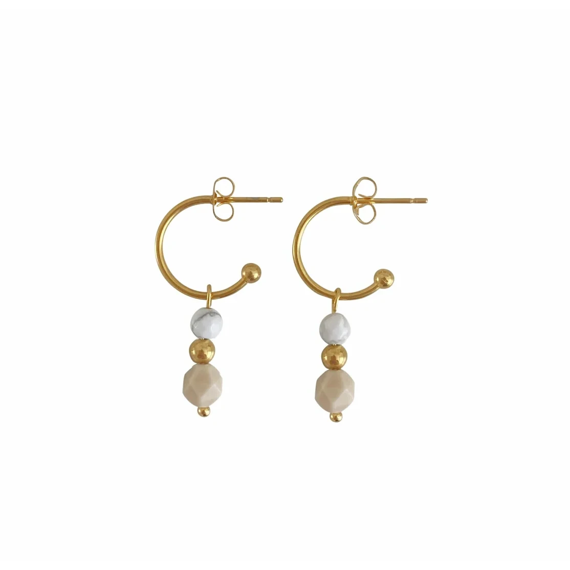 Stainless steel oorringetjes met een facet geslepen Howliet steentje, een Stainless steel kraaltje en een facet geslepen Jade steentje.