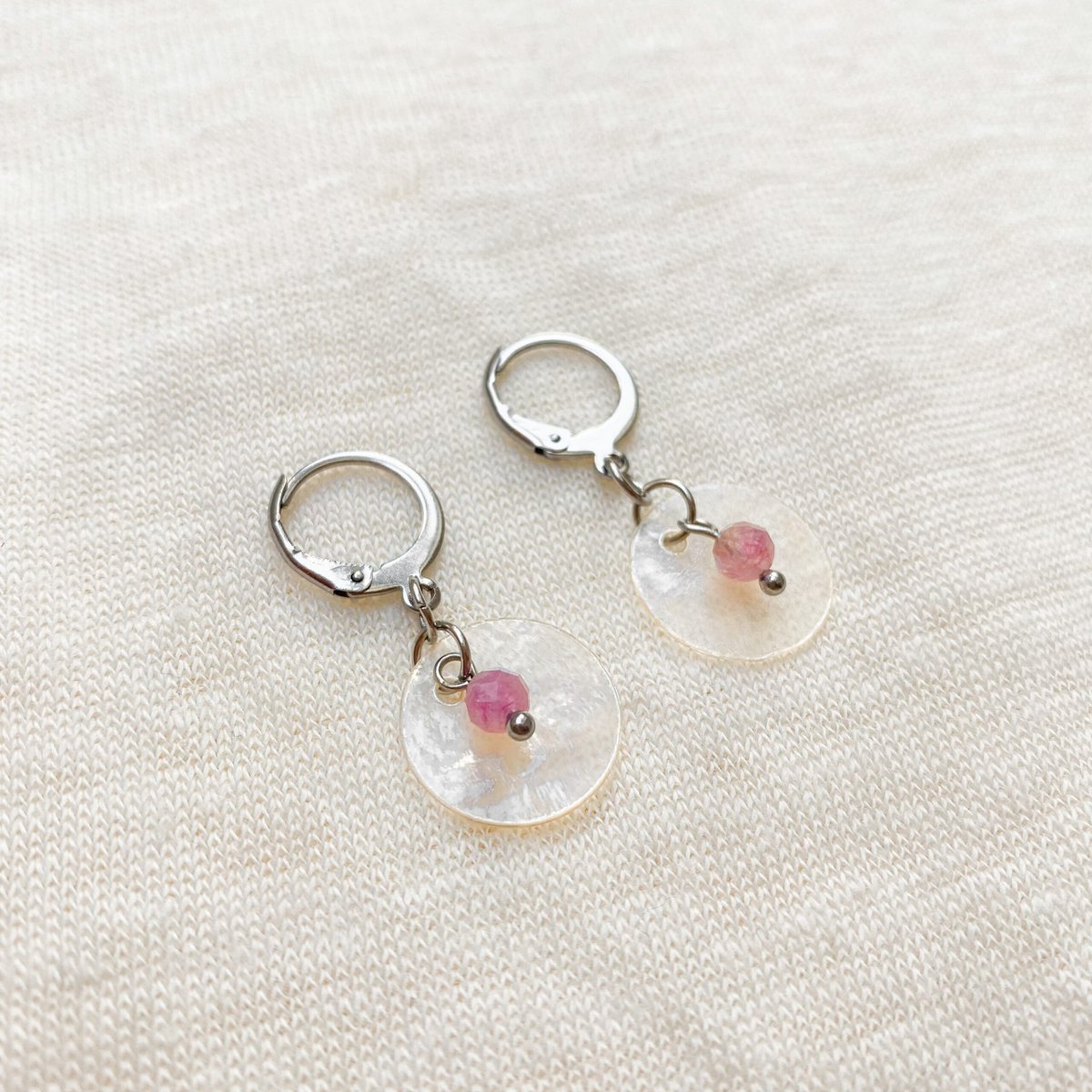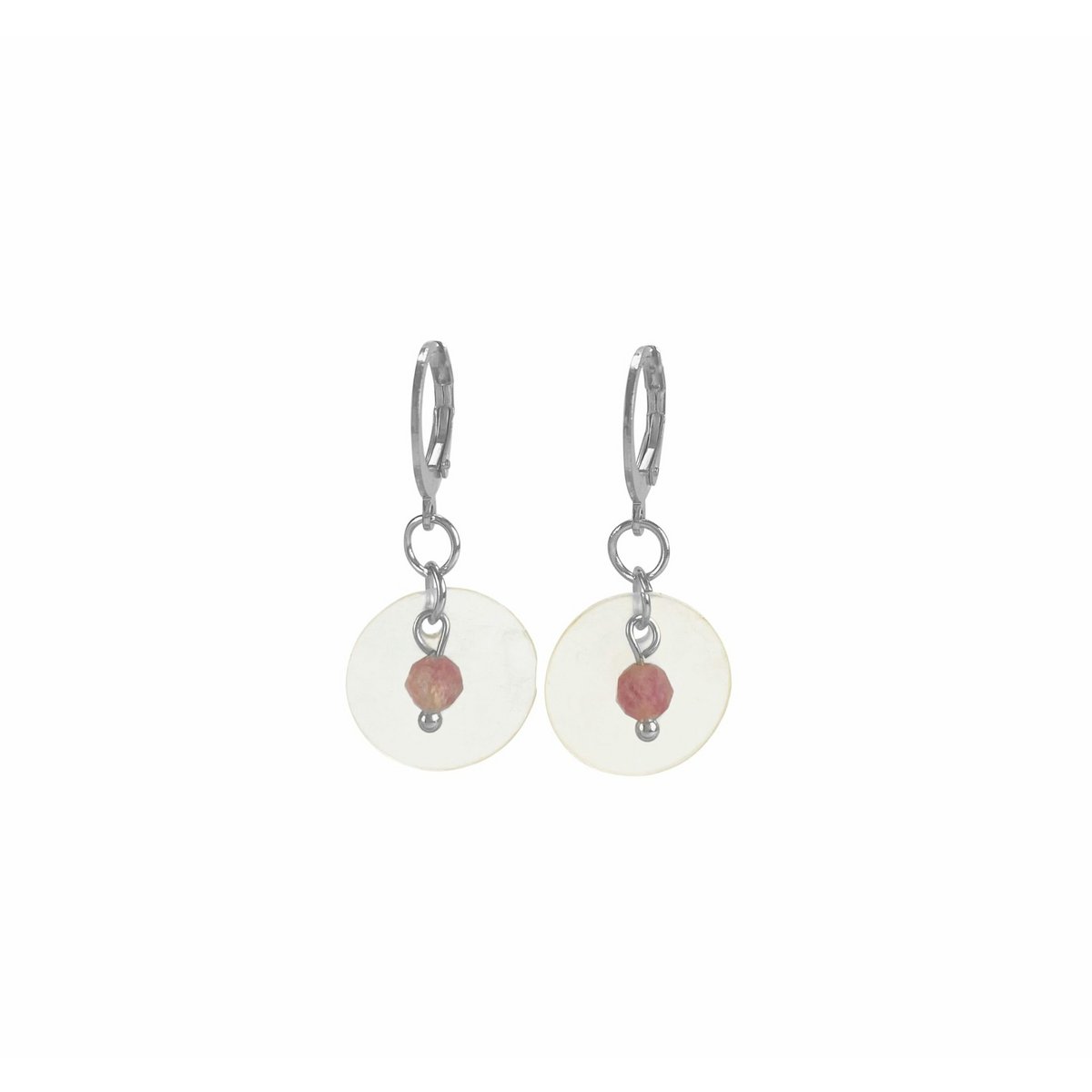 Stainless steel oorringetjes met een schelp plaatje en een facet geslepen Toermalijn steentje.