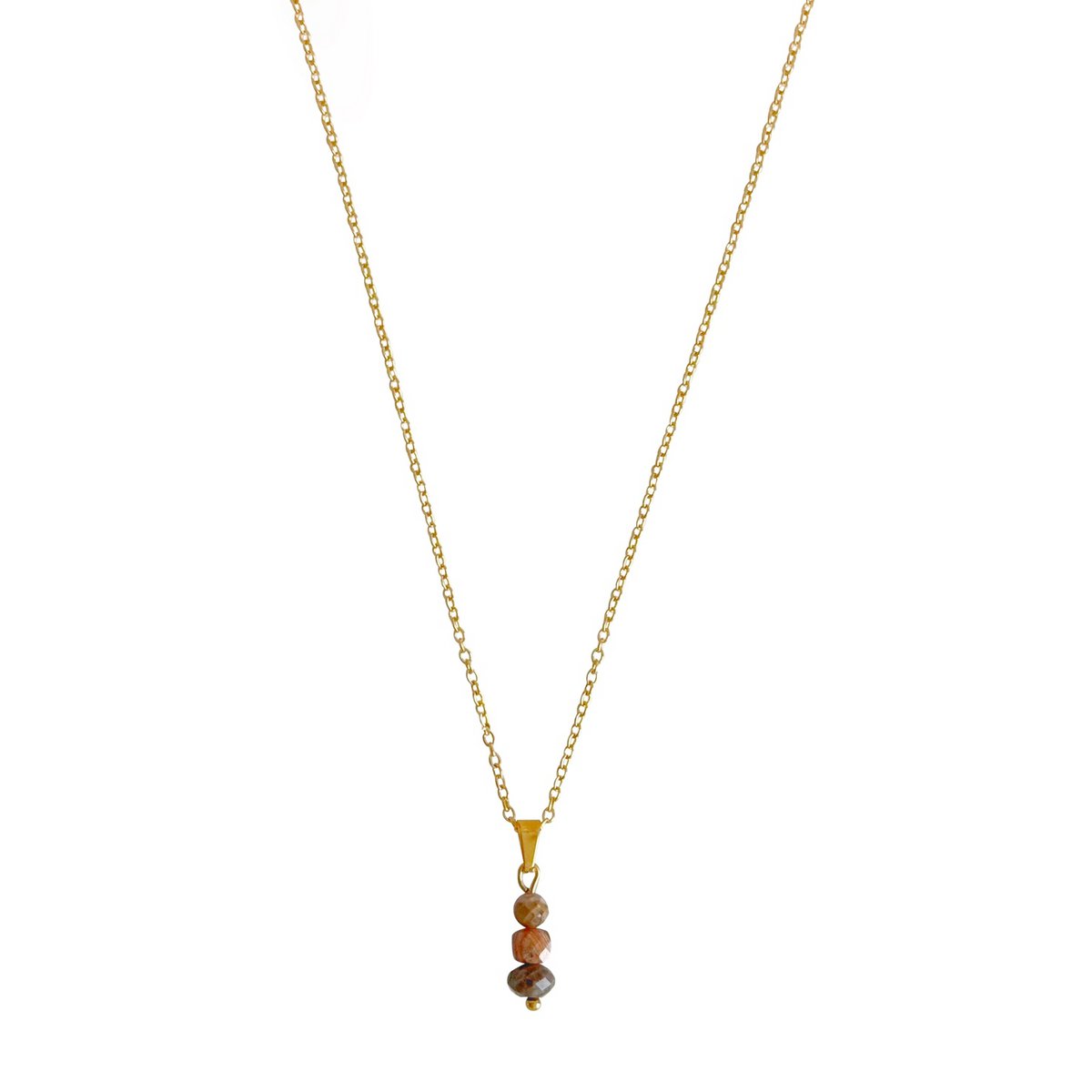 Rhodochrosiet & Labradoriet Ketting, gemaakt van stainless steel. De steentjes hebben verschillende vormen en vormen samen een mooie unieke hanger. Ook zijn de edelsteentjes facet geslepen, waardoor ze fonkelen als een diamantje. Je vindt aan de hanger van boven naar beneden: een rond Rhodochrosiet steentje, een Rhodochrosiet kubus en een bruine Labradoriet rondelle.