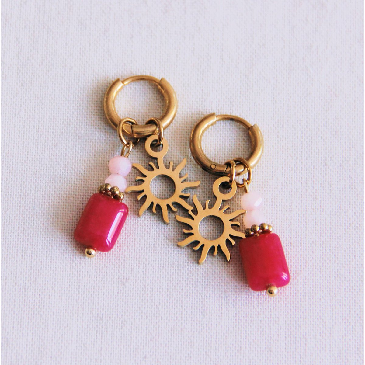 Roestvrijstalen hoepel oorbellen met rechthoekige edelsteen en zon - fuchsia