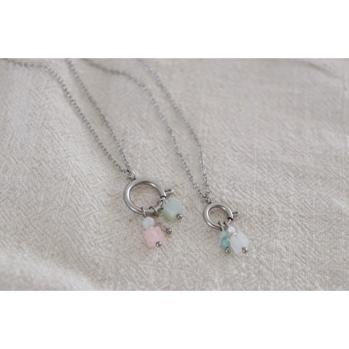 De edelsteen hangertjes aan deze ketting zijn: Rozenkwarts, Maansteen en Amazoniet.