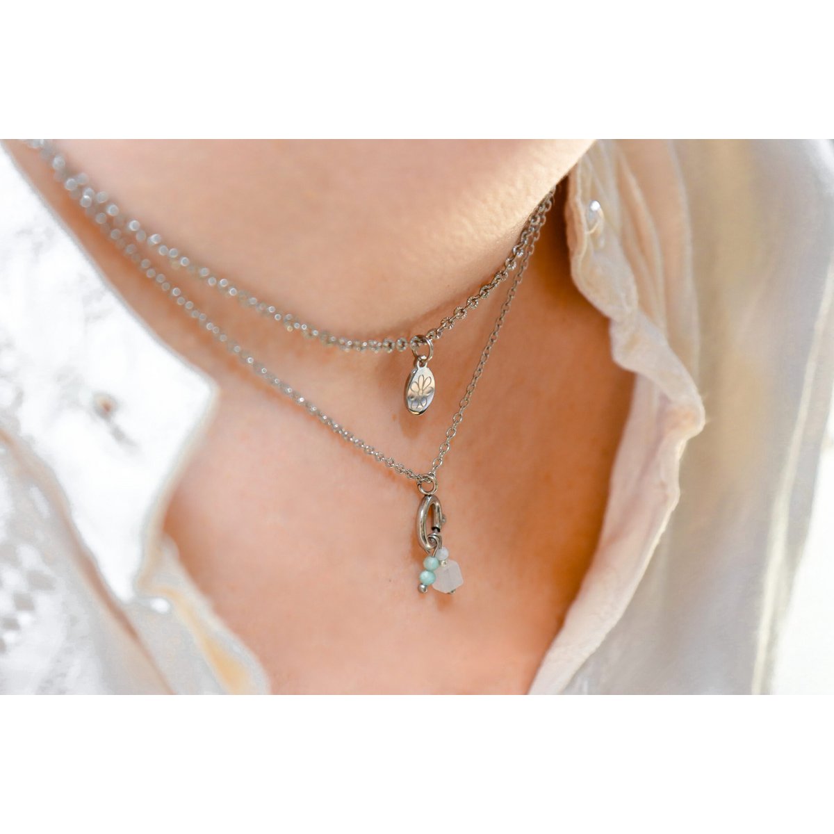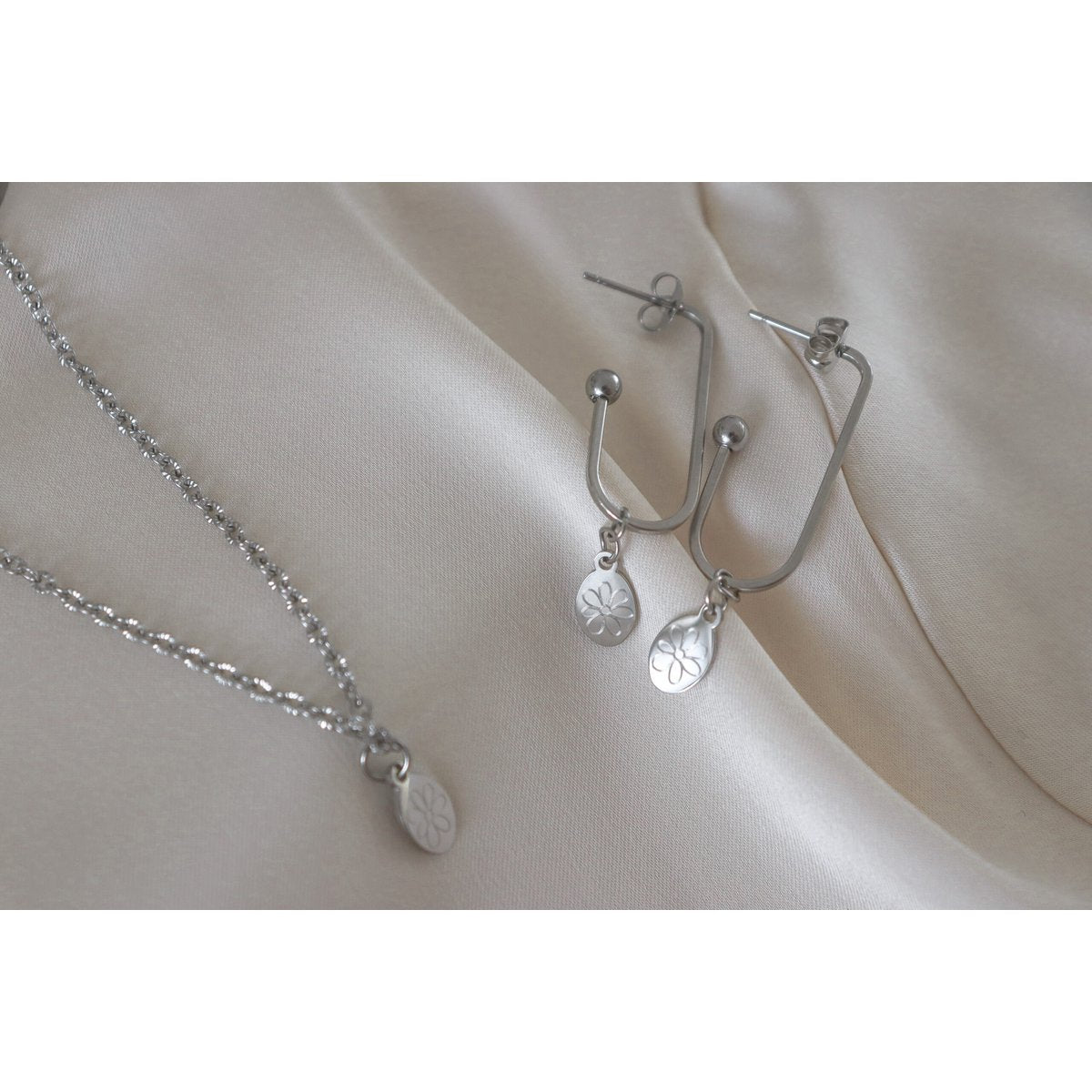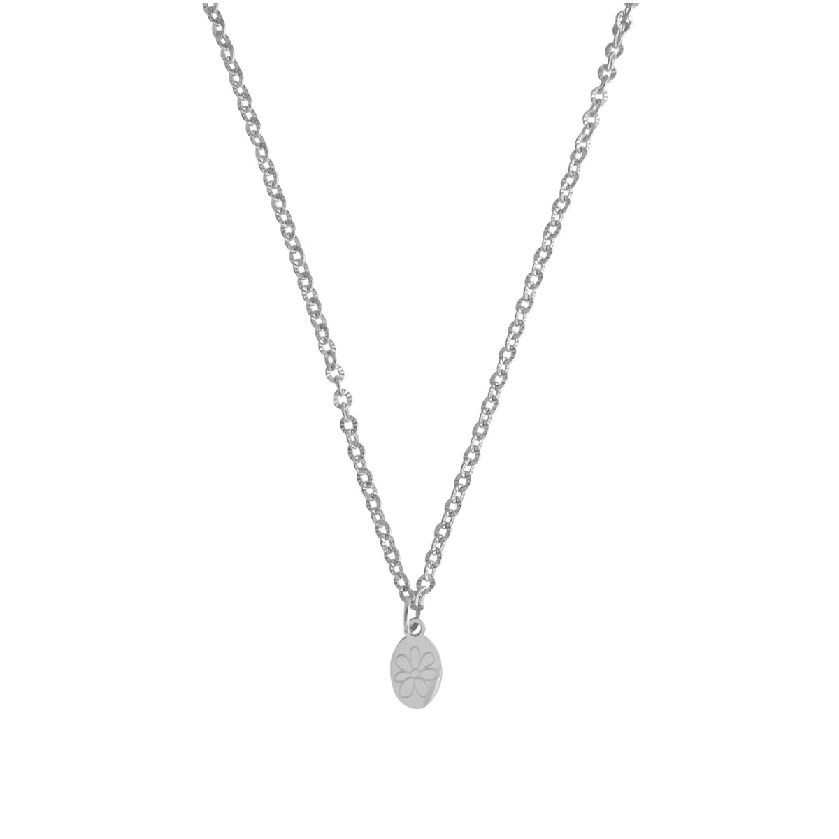 Zilveren ketting bloem bedeltje, gemaakt van stainless steel. Het bedeltje is in onze eigen studio gegraveerd. De ketting is wat korter dan gemiddeld en dus ook erg leuk om te combineren met meerdere kettinkjes. De schakel van de ketting heeft een mooie glinstering. Omdat de ketting van stainless steel gemaakt is (net als alle andere sieraden in onze collectie), is de ketting duurzaam, hypoallergeen, kleurvast en betaalbaar.